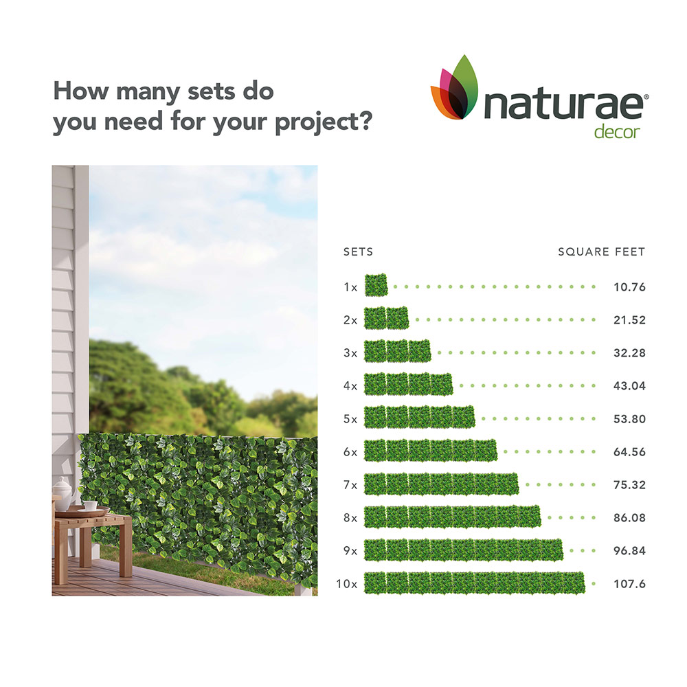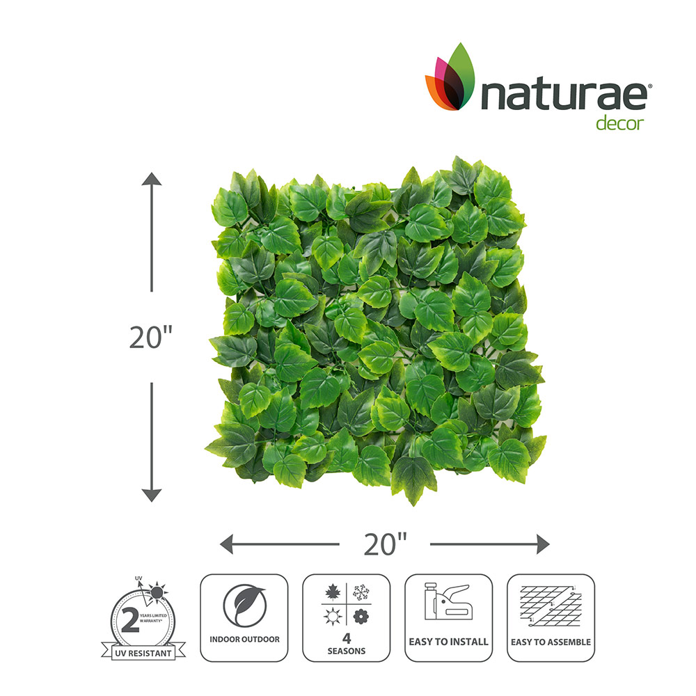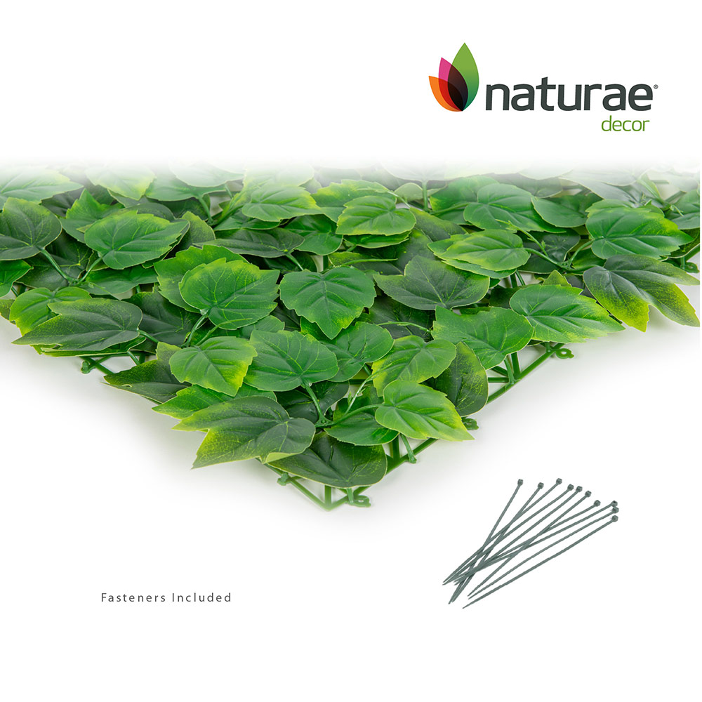 Create an instant green wall with Naturae Decor Foliage Decor Panels featuring mixed ivy leaves. Each 20 in x 20 in panel delivers dense, layered greenery that replicates the natural look of real ivy, making it perfect for transforming walls, fences, or commercial spaces into vibrant vertical gardens. Crafted from durable, UV-resistant materials, these panels help maintain their color and realistic appearance season after season. Easy to connect and install, they provide a fast, maintenance-free decorative solution backed by a 2-year limited warranty.