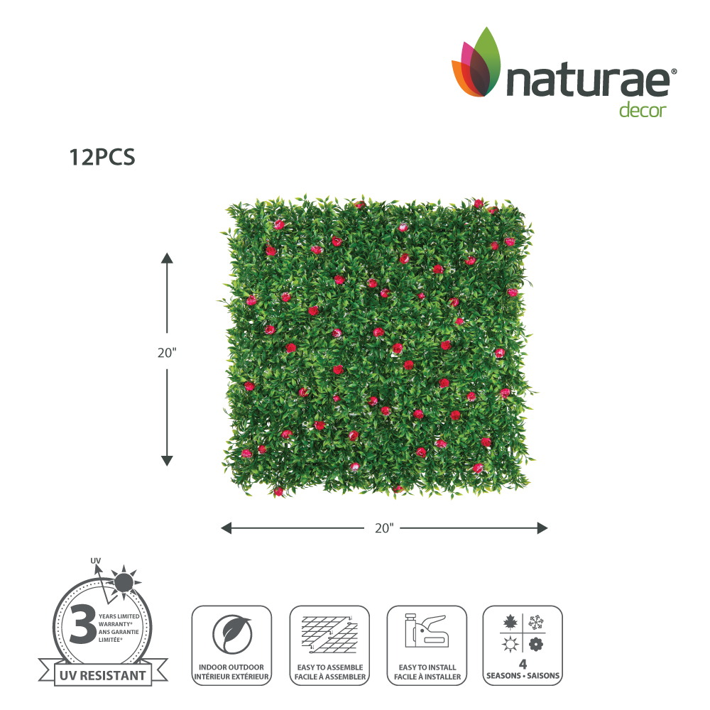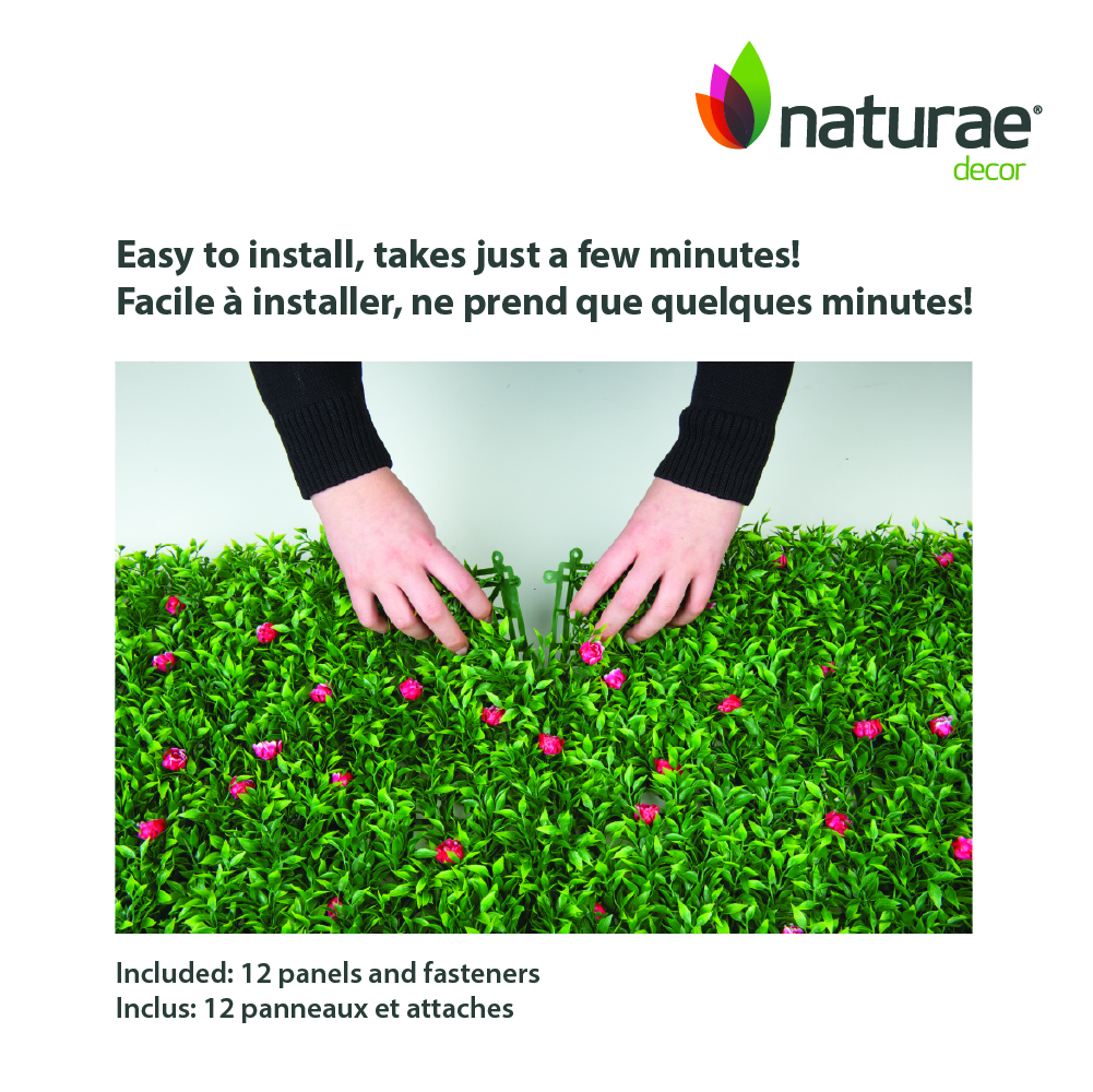 Naturae Decor green wall panels are the ultimate solution for your next DIY project. They can be easily cut to fit any space and are easy to install securely using the included fasteners. You can fold and roll these pieces of artificial greenery to cover any shape or surface flawlessly, without any gaps. Perfect to create privacy on your deck, patio, or balcony. You can even let your creativity flow by designing trendy wall art, an artificial living wall or an impressive background for a party or a photo shoot. The panels are made of premium quality UV resistant polyethylene to prolong their life. A cost-effective way to spruce up your favourite space, whether it is indoor or outdoor. Included in each package includes one panel and the fasteners to easily install it in your space. Backed by our 3-year warranty, our 20 in x 40 in panels and built-in backing grids are durable and made to last through the seasons.